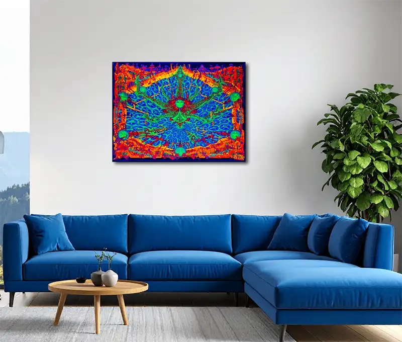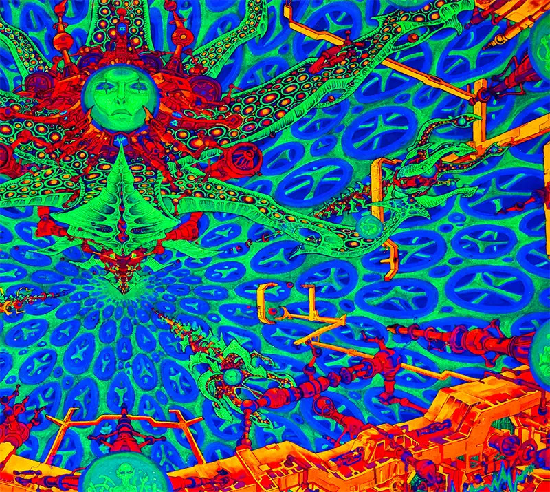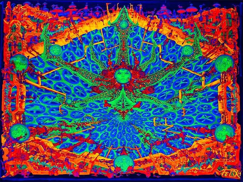 In diesem Werk entfaltet Stöver ein hypnotisches Geflecht aus Geometrie und Mythos. Aus dem neonleuchtenden Zentrum tritt ein maskenhaftes Antlitz hervor, umgeben von pulsierenden Strahlen und organischen Tentakeln. Die fluoreszierenden Farben, durch UV-Licht aktiviert, erzeugen eine vibrierende Tiefenwirkung. Architekturfragmente, Energiebahnen und kosmische Sphären verschmelzen zu einem psychedelischen Spiegelraum, in dem Wahrnehmung und Fantasie ineinander übergehen.