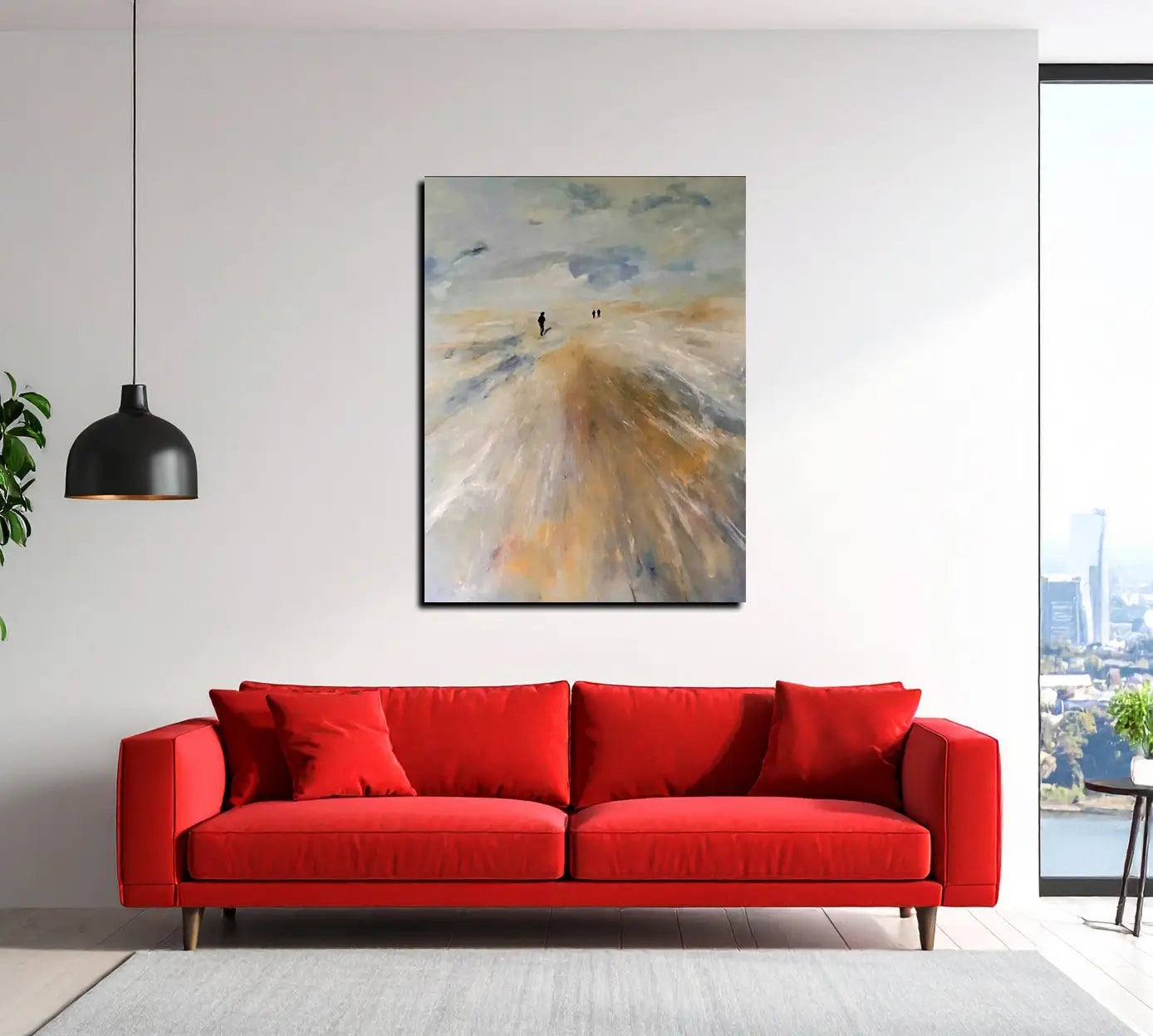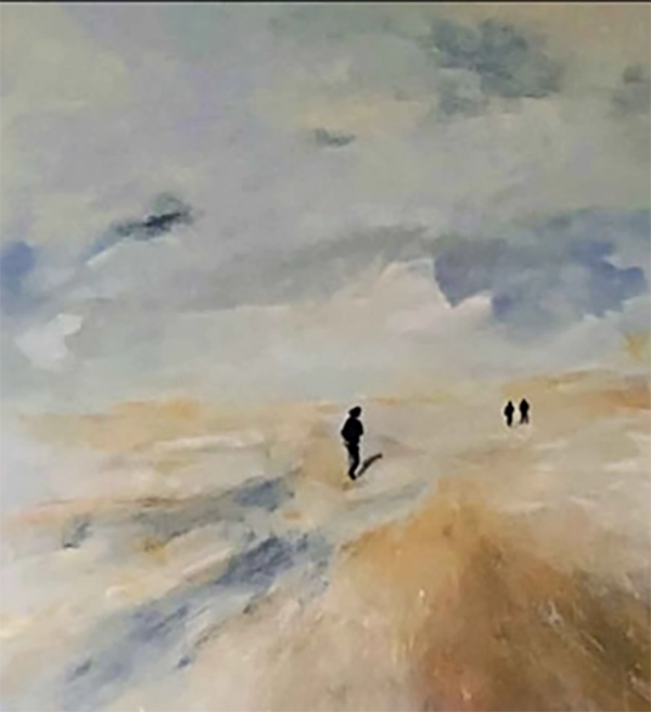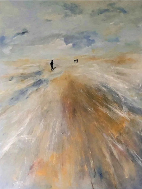 Dieses Bild zeigt eine weite, helle Landschaft, die an einen Strand oder eine Wattenmeer-Ebene erinnert. Der Himmel ist bedeckt und bewölkt, in gedeckten Grau- und Blautönen gehalten. Der Boden ist in warmen, ockerfarbenen Tönen sowie Grau und Blau gemalt und wirkt nass und spiegelnd. Drei kleine, dunkle Figuren sind in der Ferne zu erkennen, die eine weite, einsame Atmosphäre vermitteln. Die Maltechnik ist impressionistisch und pastos, was dem Bild eine dynamische und leicht melancholische Stimmung verleiht.