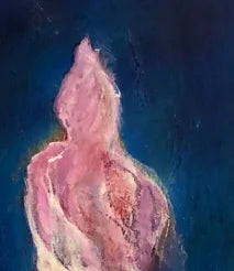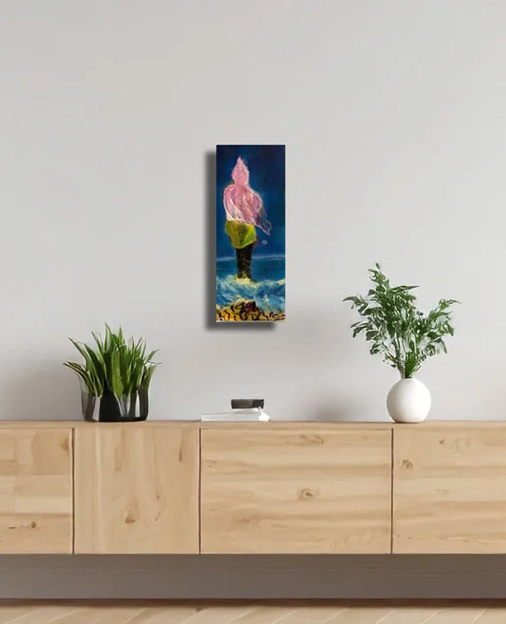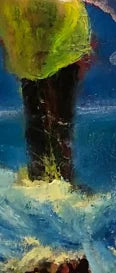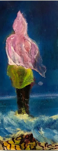 The upper part of the figure is rendered in delicate shades of pink and white, appearing fluid and almost transparent, like a cloth fluttering in the wind. The lower part glows in a vibrant, almost neon green. The background is a deep, mysterious dark blue, creating a strong contrast to the brightly lit central figure. The waves in the foreground are painted with dynamic, impasto brushstrokes in blue, white, and yellow, lending the image a palpable sense of movement and emotional intensity. Dark rocks or seaweed at the bottom provide an earthy accent.