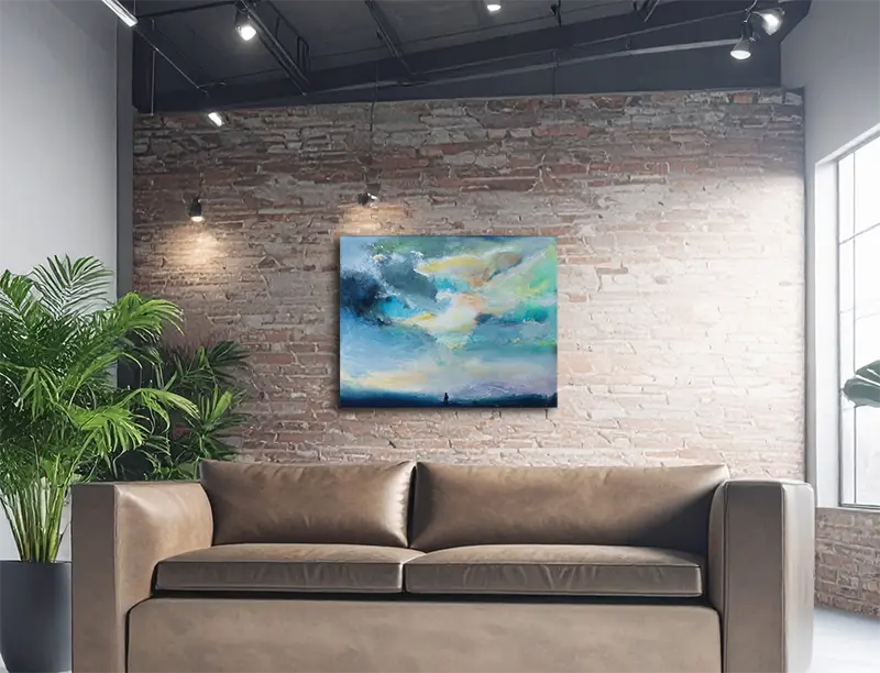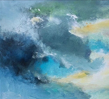 Das Gemälde "Wolke 1" ist eine abstrakte Landschaftsdarstellung, die eine einzelne Figur in der Ferne zeigt. Der obere Teil des Bildes wird von einem dramatischen, weiten Himmel dominiert, der mit breiten, lockeren Pinselstrichen in verschiedenen Blau-, Türkis-, Gelb- und Weißtönen gemalt ist.